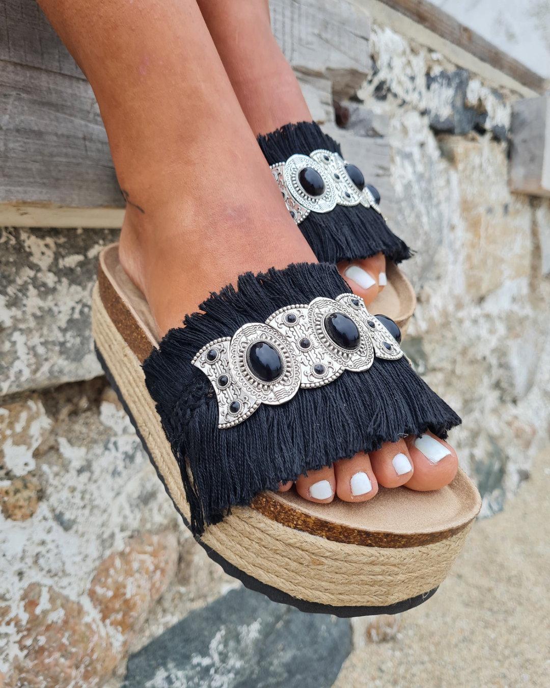 Sandalias decoradas a mano con accesorios metálicos.